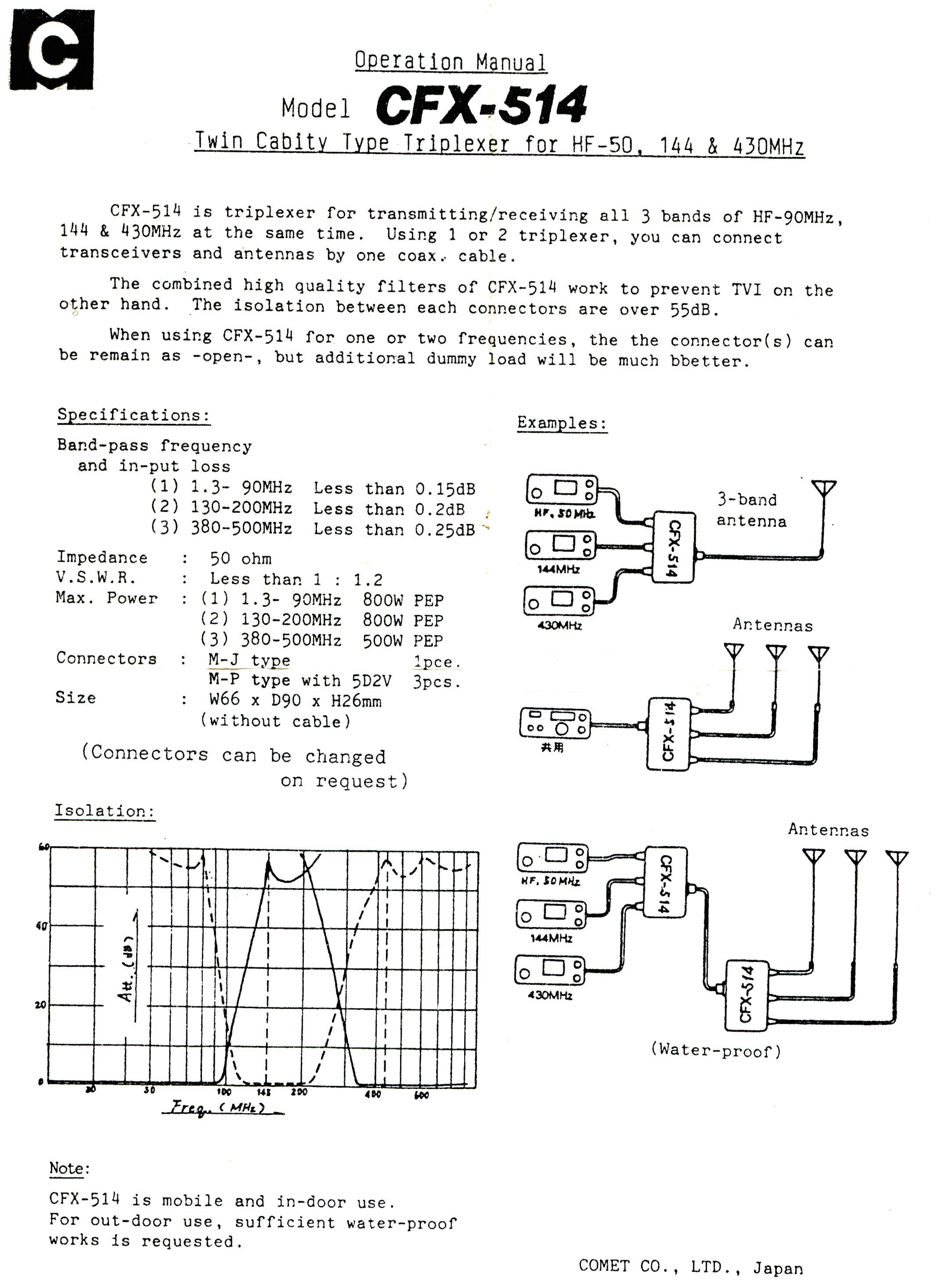 Niedrogi triplekser firmy Comet przeznaczony do podłączenia trzech radiostacji (lub radiostacji wielopasmowej) do jednej anteny wielopasmowej, bądź trzech oddzielnych anten do jednego kabla.