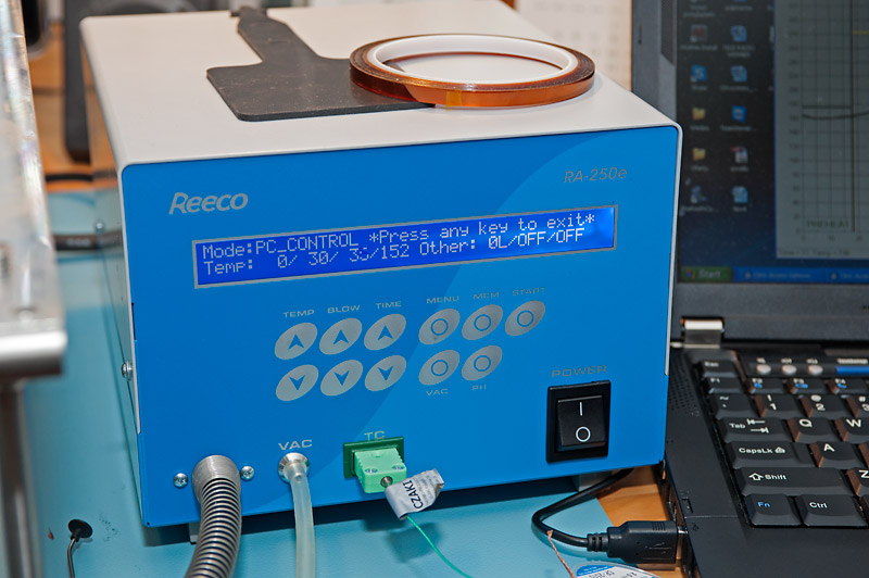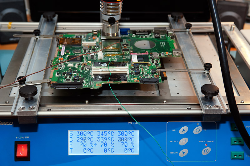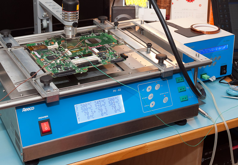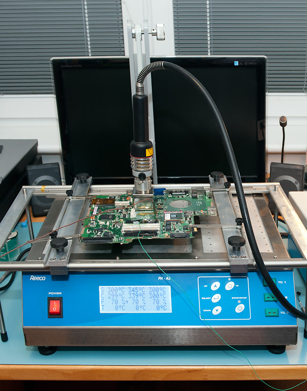 Płyta została umieszczona na podgrzewaczu RECCO RE-PH-A3 za pomocą statywu RE-XY. Kontrola procesu została zapewniona przy użyciu notebooka wyposażonego w oprogramowanie sterujące dołączone do stacji RE-RA250. Układ został przylutowany z powrotem na oczyszczonej płycie przy użyciu profilu zarejestrowanego podczas jego demontażu.