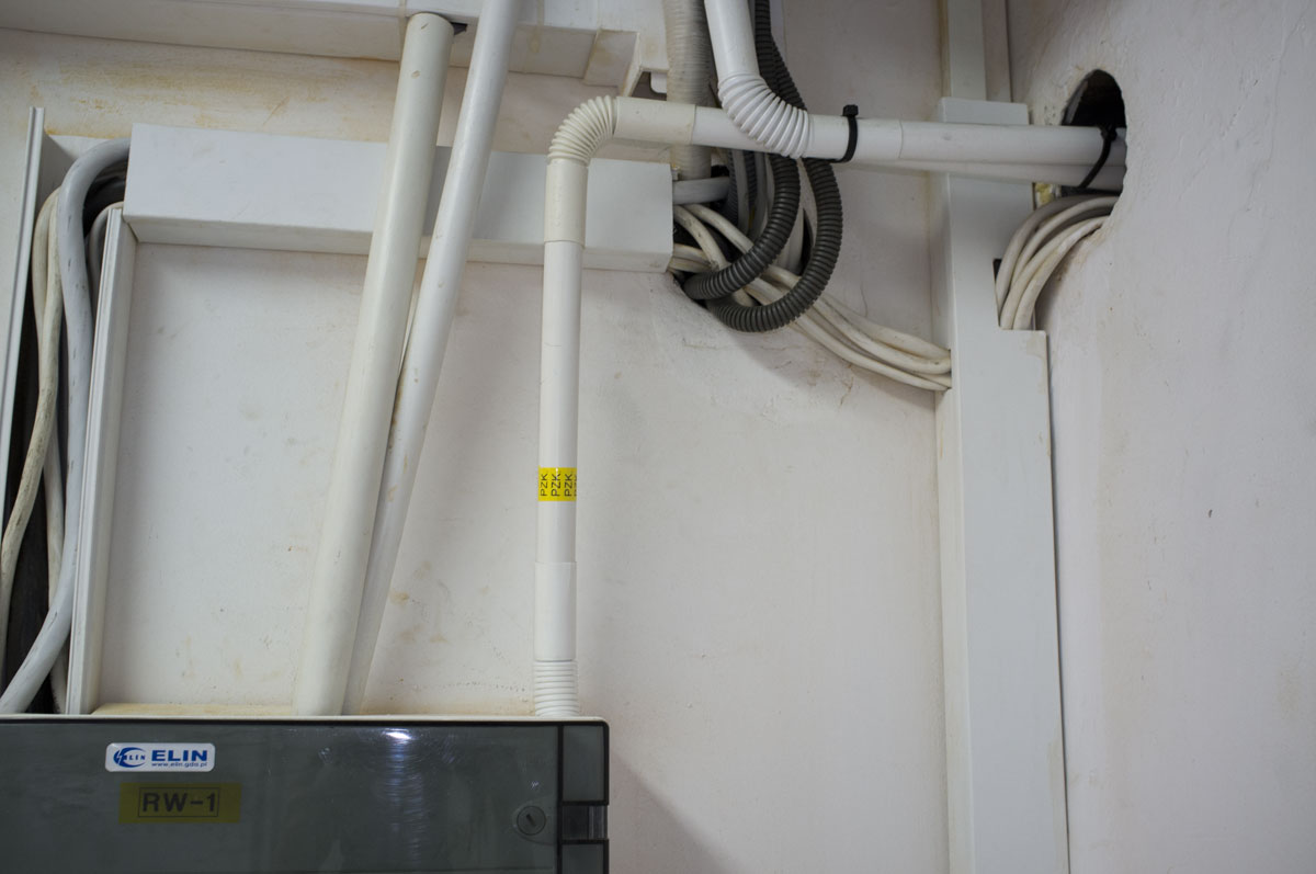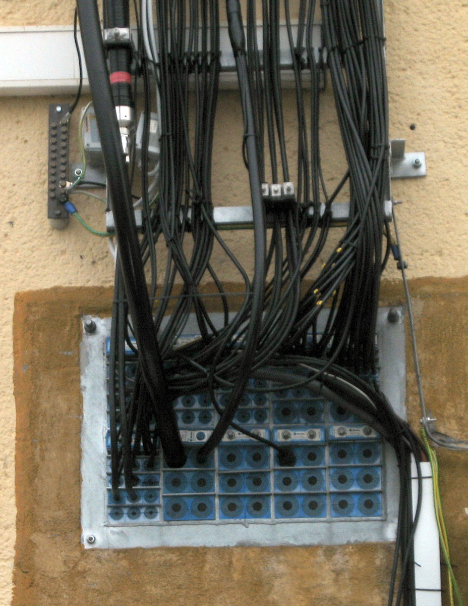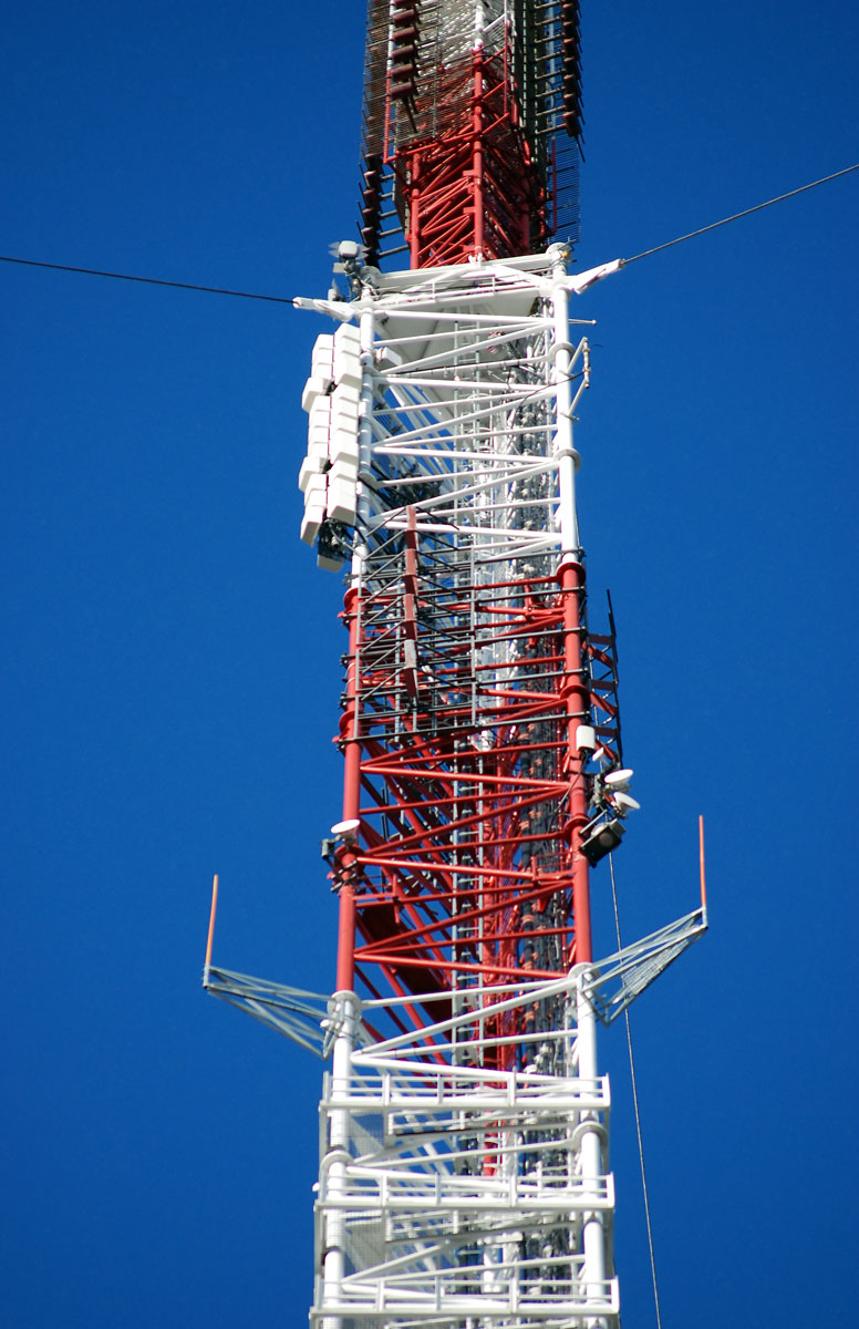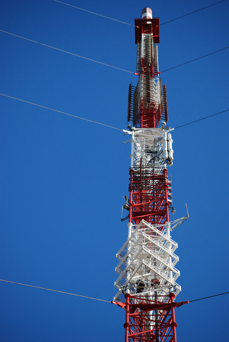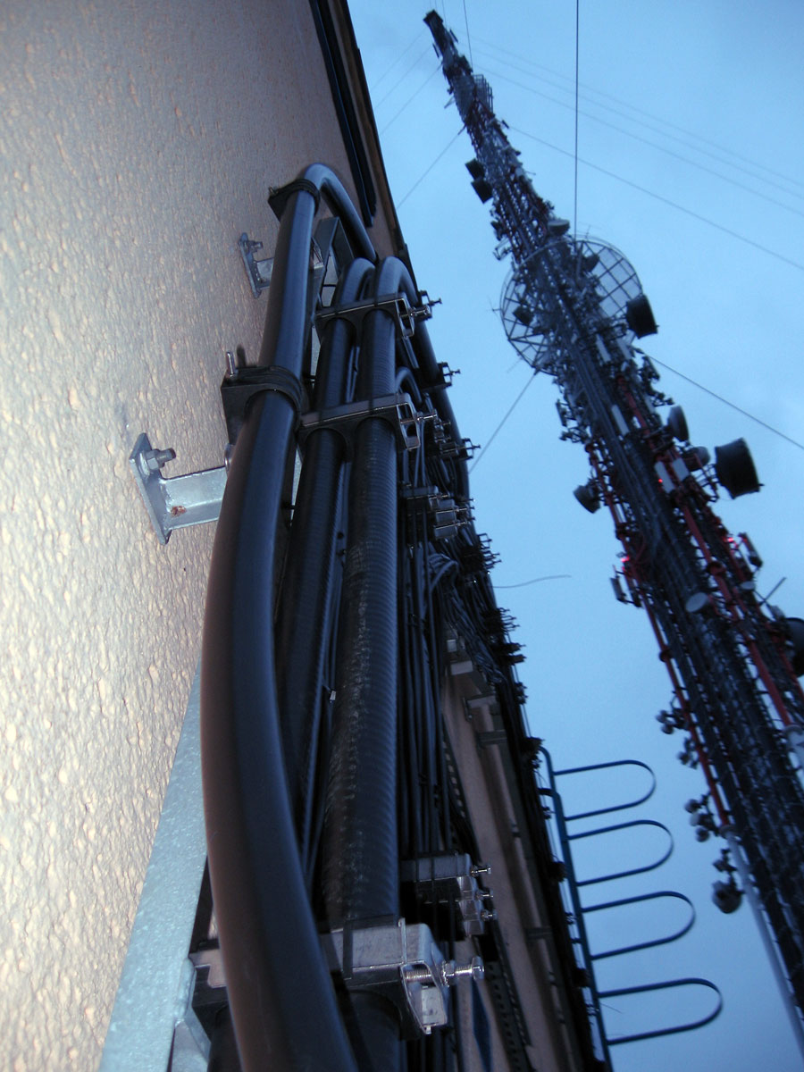 Łączna długość drogi kablowej przekracza 190m, a ponad 180m jest poprowadzone kablem DRAKA RFA 1.5/8". Łączniki anten i doprowadzenie sygnału do szaf z aparaturą wykonane jest kablem RFS 1/2". Kabel na drabinach pionowych i estakadach kablowych umocowany jest za pomocą ponad 160 uchwytów typu FC-B 2x1.5/8". Anteny Radmor typu 3282 (3x 5/8λ na 145MHz) i 3284 (18x1/2λ dla 435MHz) umocowane są w odległości 1,8m od południowych krawężników masztu za pomocą skratowanych konstrukcji stalowych, ocynkowanych ogniowo. Głowice anten zamontowane są na wysokości 161m n.p.t. Każdy ze wsporników o wymiarach 1900x850x600mm waży 102kg i mocowany jest do masztu za pomocą ośmiu śrub M16. Konstrukcje podantenowe wykonane są w taki sposób, aby było możliwe wyjście po nich w celu wymiany i konserwacji anten. Cały osprzęt montażowy wsporników anten i toru kablowego wykonany jest ze stali nierdzewnej A2-70. Aparatura przemienników zajmuje dwie szafy 19" o wysokości 42U. Na wyposażenie składają się: