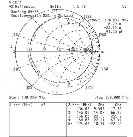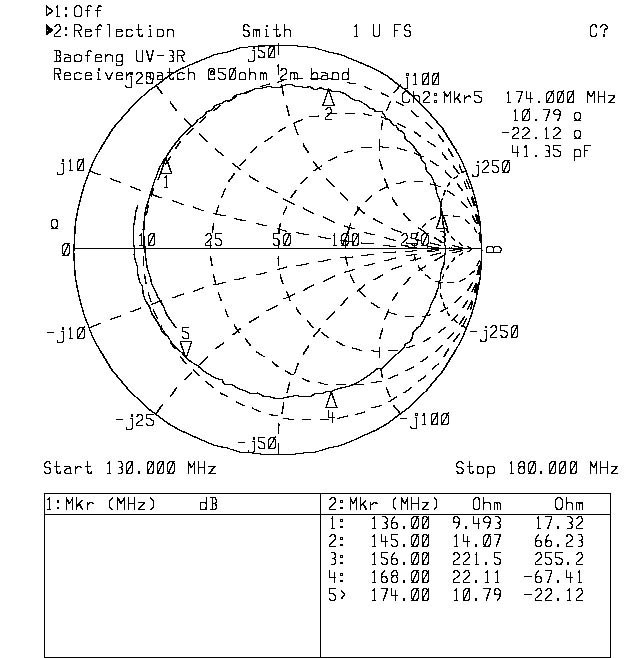 8. Dopasowanie odbiornika. Pomiar dopasowania odbiornika wykonałem analizatorem wektorowym, oddzielnie dla każdego z pasm z niewielkim marginesem wykraczjącym po za zakres pracy odbiornika. Dopasowanie odbiornika praktycznie nigdy nie jest podawane przez producentów, a ma wpływ na to, ile sygnału odebranego przez antenę zostanie użyte do mieszania i demodulacji, a ile zostanie zmarnotrawione w wyniku odbicia. Dopasowanie energetyczne nie pokrywa się co prawda z dopasowaniem pod względem poziomu szumów, niemniej jednak większośc masowo produkowanych urządzeń odbiorczych wstrojona jest na maksymalne dopasowanie impedancyjne - jest to metoda prostsza i większości zastosowań wystarczająca. Wykresy przedstawiają dopasowanie w skali logarytmicznej i kołowe wykresy Smitha.