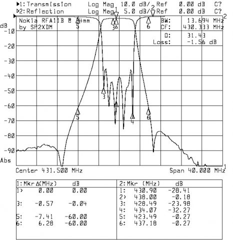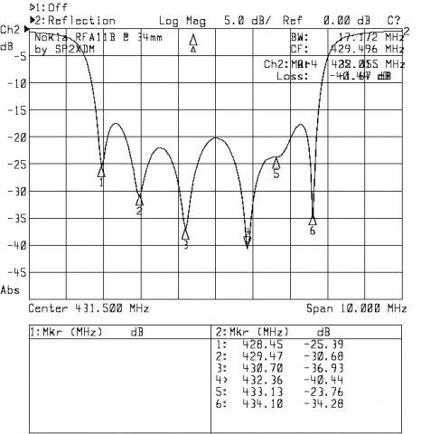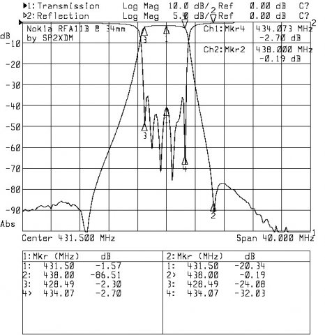 We wrześniu 2012 postanowiłem wrócić do tematu tych filtrów i spróbowac przestroić je w sposób optymalny - tzn. tak dobrać długości rezonatorów i pojemności aby w miarę zachowac oryginalny kształt charakterystyki. Do prób użyłem filtra RFA11B. Oryginalne tuleje z miedzi o długości 30mm zastąpiłem mosiężnymi o nieco większej długości. Początkowo zastosowałem najdłuższe możłiwe - 35mm (co widac na jednym ze zdjęć). Niestety, taka długość pozwala zestroić filtr na 421MHz, konieczne okazało się stoczenie 1mm ze szczytu. Długość 34mm jest optymalna dla amatorskiego pasma 70cm. Filtr zestroiłm tak, aby miał jak najmniejsze tłumienie przepustowe na odbiorczych kanałach przemiennikowych, a na zakresie przemiennikowych kanałów nadawczych tłumił ponad 80dB. Rezultaty tak wykonanej przeóbki można zobaczyć na zdjęciach i wykresach poniżej.