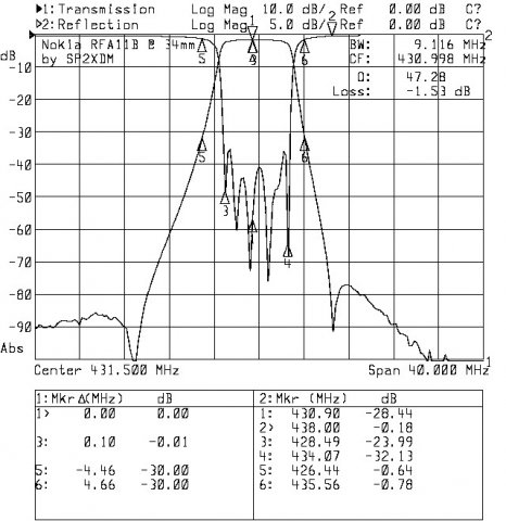 Możliwe jest uzyskanie zarówno dość szerokiego pasma przepustowego 5MHz przy tłumieniu ok 2,5dB jak również zestrojenia wąskopasmowego, około 1MHz przy tłumieniu 1,5dB. Filtr znakomicie wycina wszystkie kanały radiowe i telewizyjne o co najmniej 80-90dB, co docenią zapewne budowniczowie przemienników którzy swoje konstrukcje stawiają na obiektach typu radiowo-telewizyjne centra nadawcze czy stacje przemienników służb profesjonalnych. Istotne może to być zwłaszcza dla tych, którzy mają do dyspozycji tylko jeden z popularnych kompaktowych duplekserów o konstukcji band-reject - które niestety w niewystarczający sposób separują wejście przemiennika od silnych sygnałów stacji radiodyfuzyjnych.