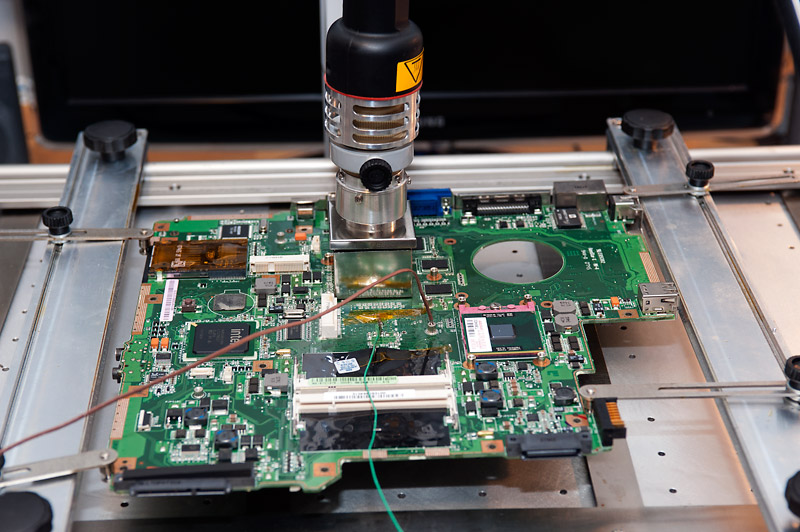 Zdemontowany przy użyciu stacji RECCO RE-RA250 układ został oczyszczony grotem nożowym PACE PC11240037 umieszczonym w rączce TD-100 a następnie paskiem typu Solder-Wick. 800 (osiemset !) kulek ułożyliśmy ręcznie na bardzo cienkiej warstwie topnika w paście typu Kester Tacky Flux TSF6502. Ułożenie kulek zajęło ponad dwie godziny i prawdopodobnie by się nie powiodło gdyby nie zastosowanie lupy z podświetlaniem Luxo Wave Plus. Kulki układaliśmy we dwóch, robiąc zmianę co około 200 kulek. Kulki przetopiliśmy na podgrzewaczu za pośrednictwem szablonu, ramki i sita z innym rastrem - jako ochrony przed bezpośrednim grzaniem.