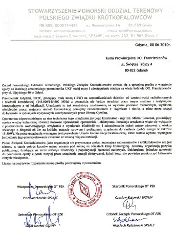 Uzasadnienie bardzo proste - Klasztor wpuszcza na wieżę kościoła tylko urządznia radiokomunikacyjne podmiotów gospodarczych przynoszących wymierny zysk w postaci wysokich opłat miesięcznych, wobec czego instalacja urzadzenia amatorskiego, nie przynoszącego zysku, jest poza zakresem zainteresowań OO. Franciszkanów.