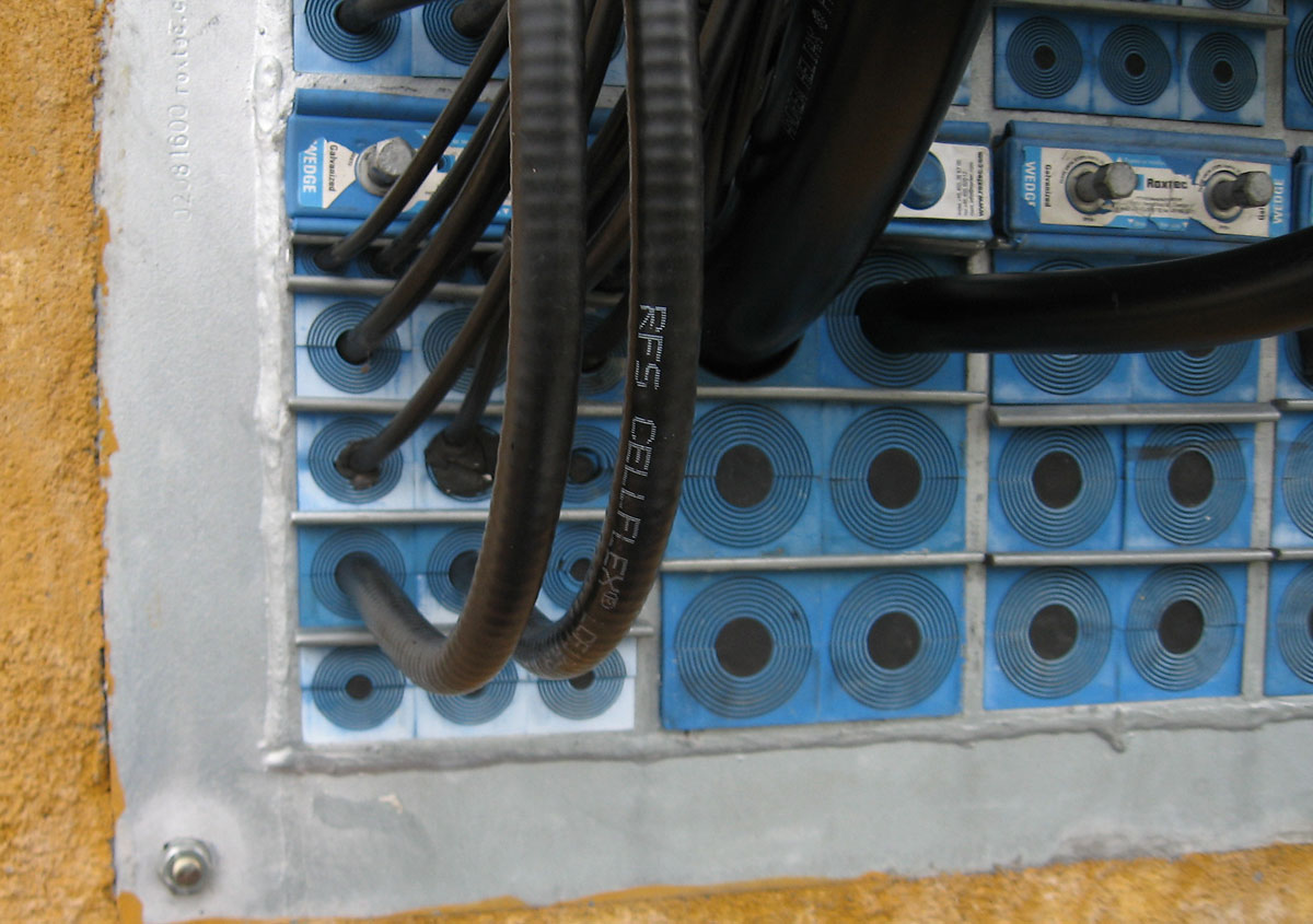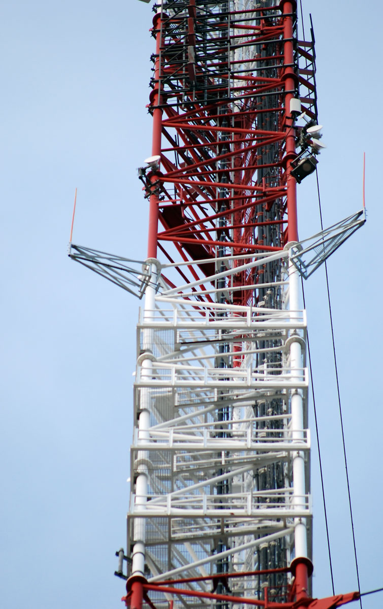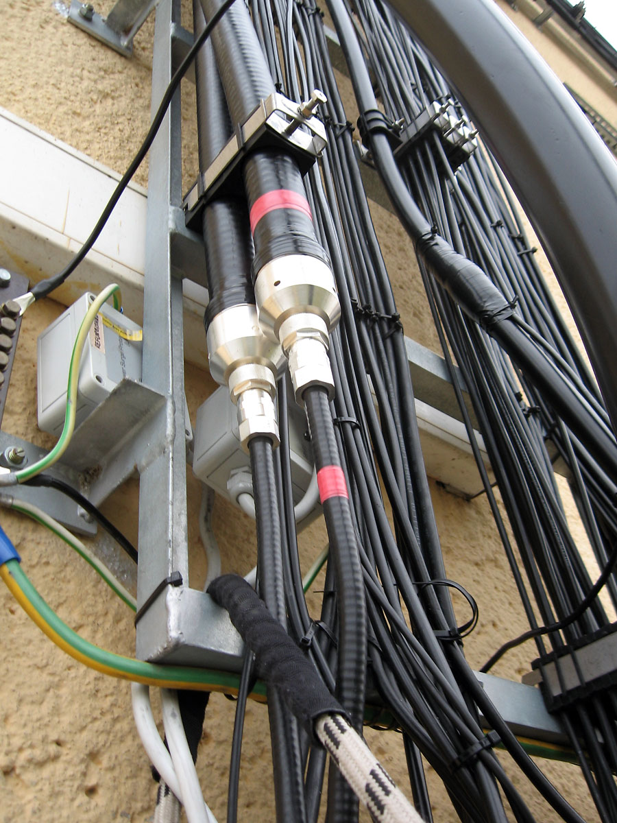 Łączna długość drogi kablowej przekracza 190m, a ponad 180m jest poprowadzone kablem DRAKA RFA 1.5/8". Łączniki anten i doprowadzenie sygnału do szaf z aparaturą wykonane jest kablem RFS 1/2". Kabel na drabinach pionowych i estakadach kablowych umocowany jest za pomocą ponad 160 uchwytów typu FC-B 2x1.5/8". Anteny Radmor typu 3282 (3x 5/8λ na 145MHz) i 3284 (18x1/2λ dla 435MHz) umocowane są w odległości 1,8m od południowych krawężników masztu za pomocą skratowanych konstrukcji stalowych, ocynkowanych ogniowo. Głowice anten zamontowane są na wysokości 161m n.p.t. Każdy ze wsporników o wymiarach 1900x850x600mm waży 102kg i mocowany jest do masztu za pomocą ośmiu śrub M16. Konstrukcje podantenowe wykonane są w taki sposób, aby było możliwe wyjście po nich w celu wymiany i konserwacji anten. Cały osprzęt montażowy wsporników anten i toru kablowego wykonany jest ze stali nierdzewnej A2-70. Aparatura przemienników zajmuje dwie szafy 19" o wysokości 42U. Na wyposażenie składają się: