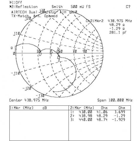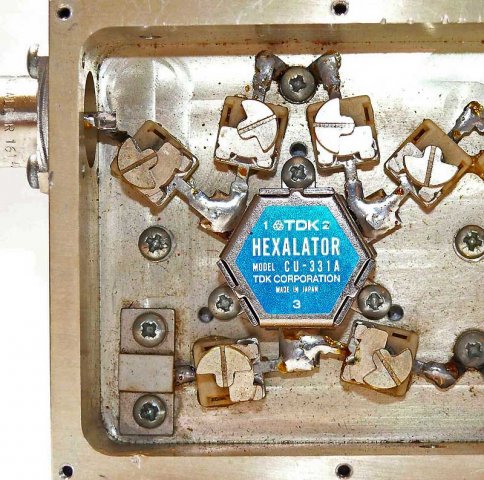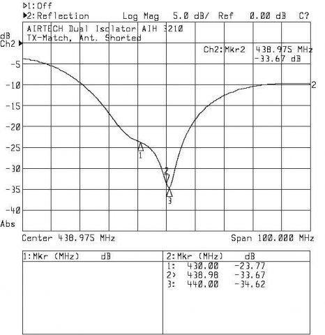 Izolator ten jest zbudowany z dwóch cyrkulatorów ferrytowych TDK Hexalator CU-331A, dwóch bezindukcyjnych rezystorów 50Ω i dwunastu trymerów dopasowujących impedancję. Izolator ten, pierwotnie zestrojony na 451.500 MHz dał się dobrze przestroić na częstotliwość 438.975 MHz z następującymi wynikami:
